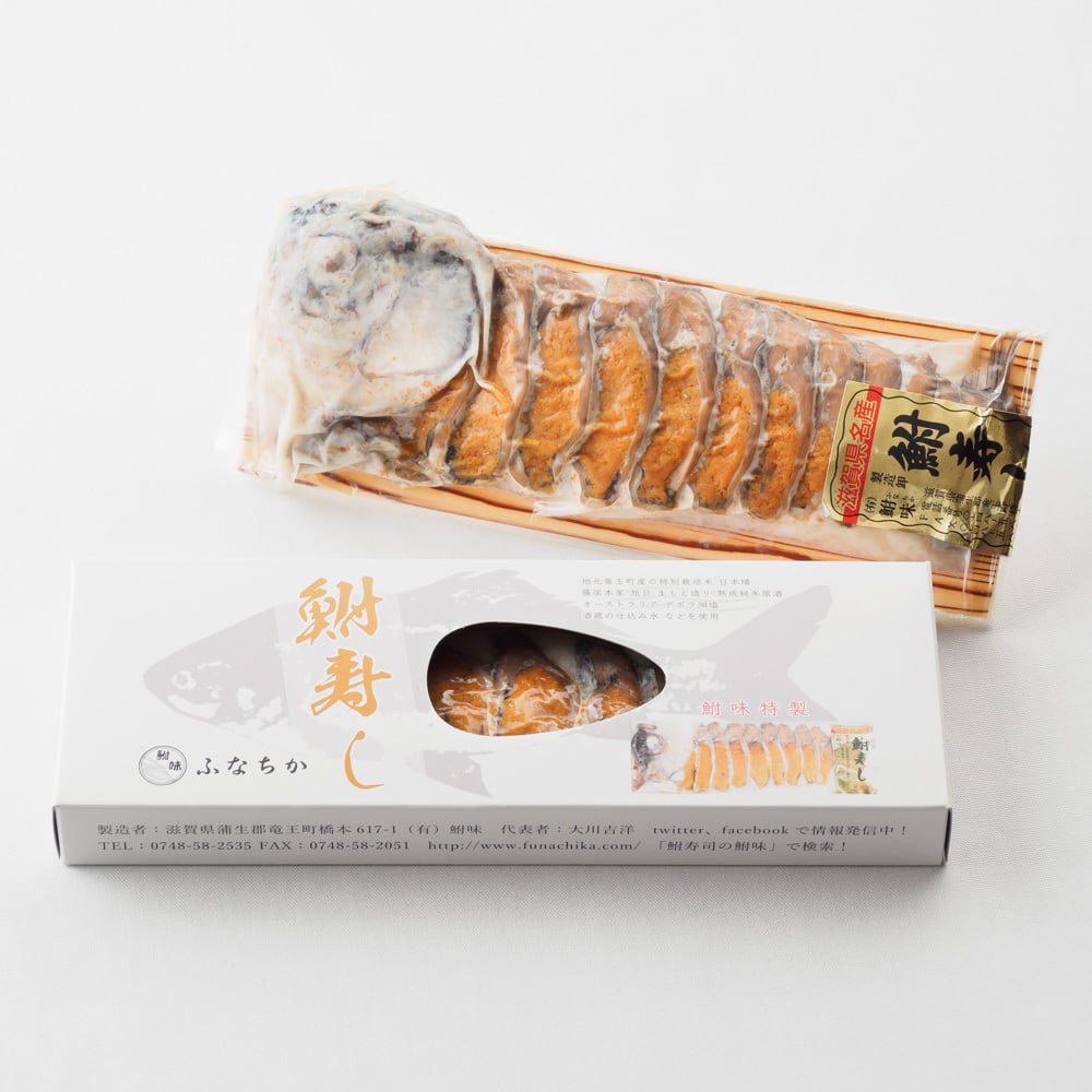 原材料名:琵琶湖産 天然子持ちにごろ鮒(琵琶湖の固有亜種)、若井農園 滋賀県蒲生郡竜王町産 特別栽培米 日本晴、オーストラリア オーガニック認証 デボラ天日湖塩プレミアム ナチュラルレイクソルトNo.3、石巻の親潮系海水 伊達の旨塩(平釜で2日間煮詰めた手作り塩)、沖縄の海水100% 浜比嘉塩(日本古来の製塩方法 流下式塩田)、藤居本家 旭日 生もと造り熟成純米原酒(鮒寿司などの手水の代わりに使用)