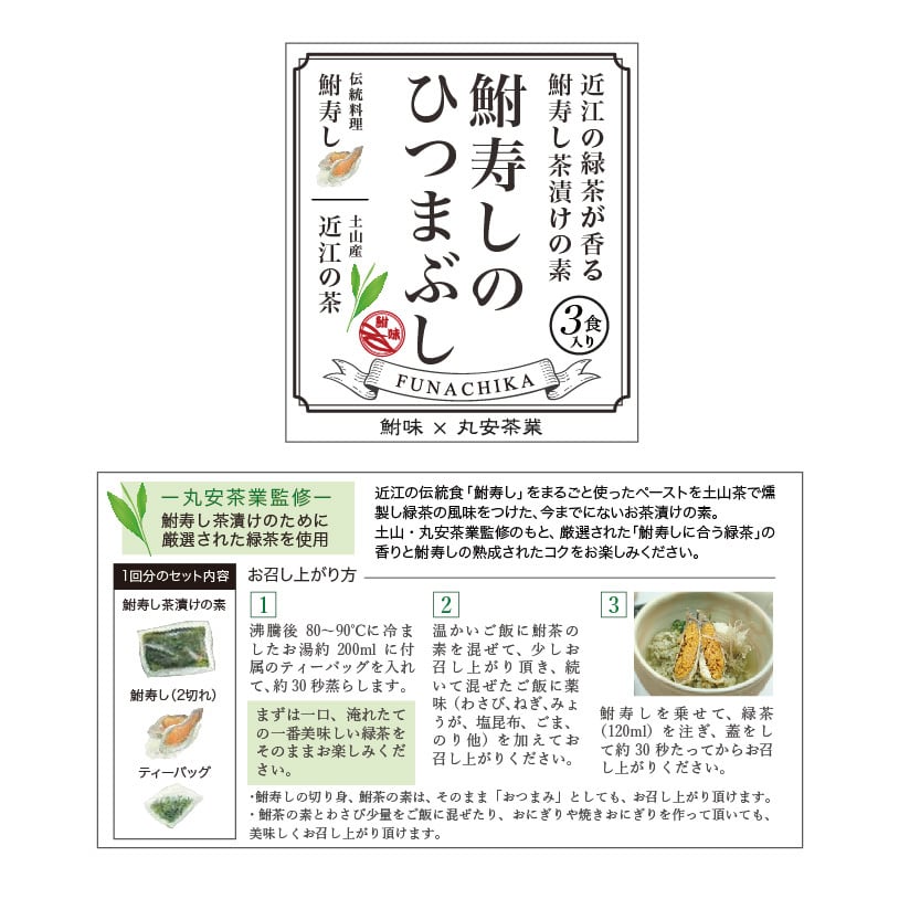 滋賀県土山にある丸安茶業株式会社監修のもと、厳選された「鮒寿司に合う緑茶」の香りと鮒寿司の熟成されたコクをお楽しみください。