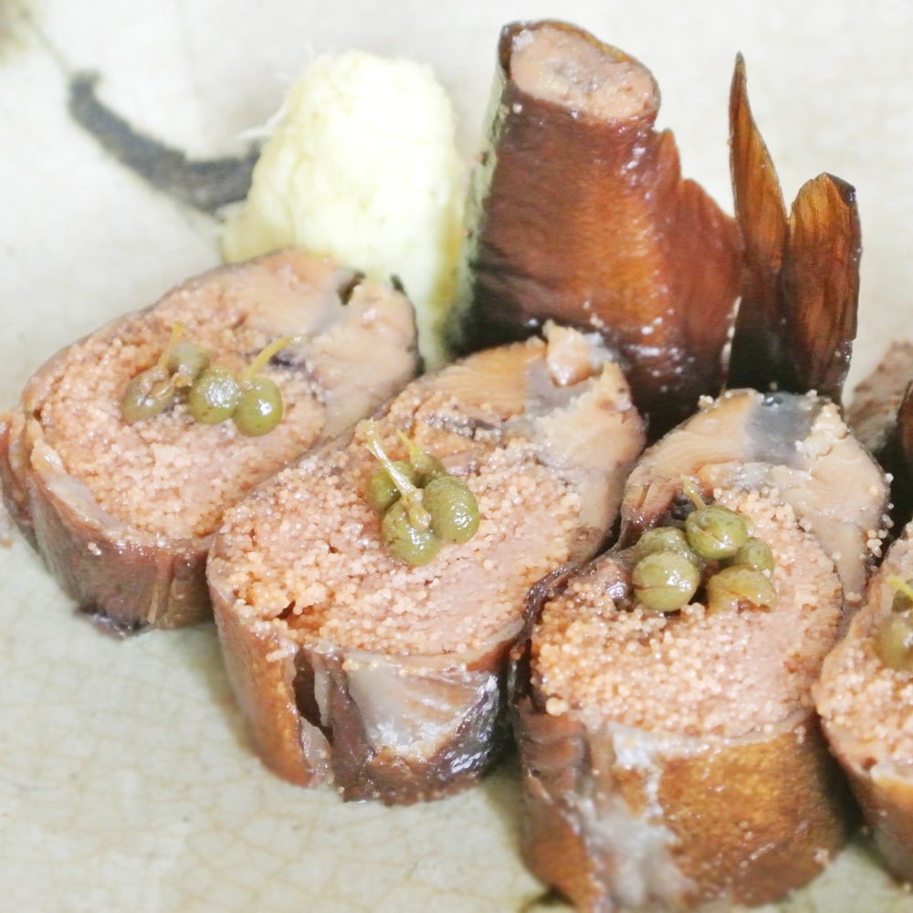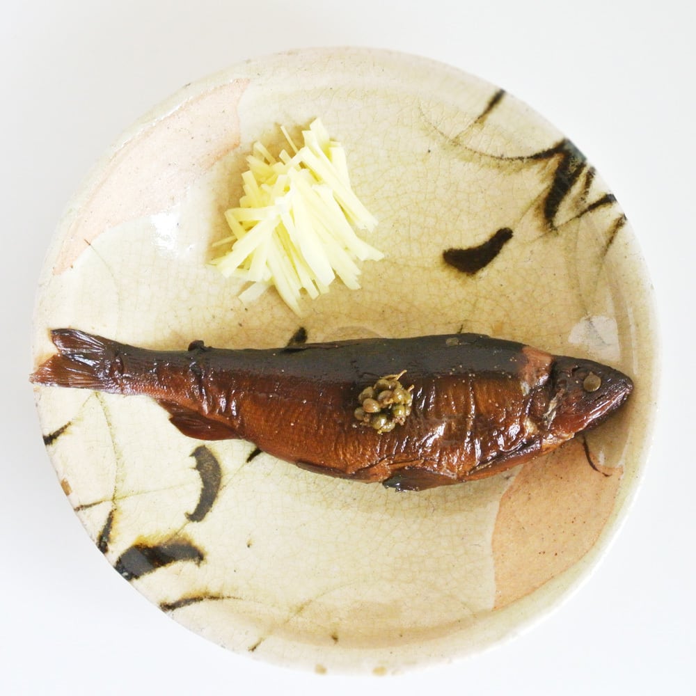 祇園の有名料亭で修行を積んだ料理人の作る「鮎の甘露煮」です。琵琶湖産の脂のりがいい養殖鮎を使っています。甘露煮も保存食として親しまれており、フランスの「グラッセ」と類似部分がございます。