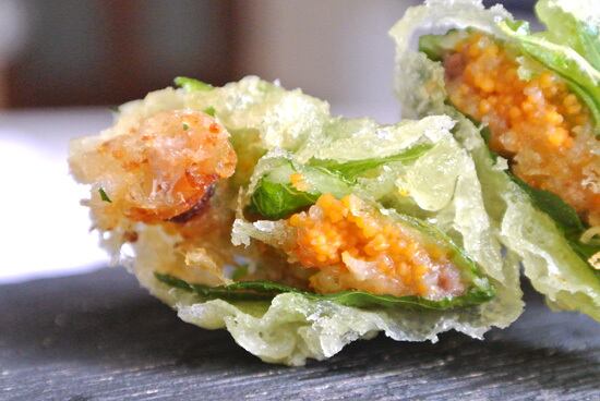 鮒寿司の切身に衣を付け、青じそ(えごまの葉も美味)に包んで更に衣を付けたら、さっと揚げます。揚げたてを天つゆ、塩、醤油などにつけてお召し上がりください。