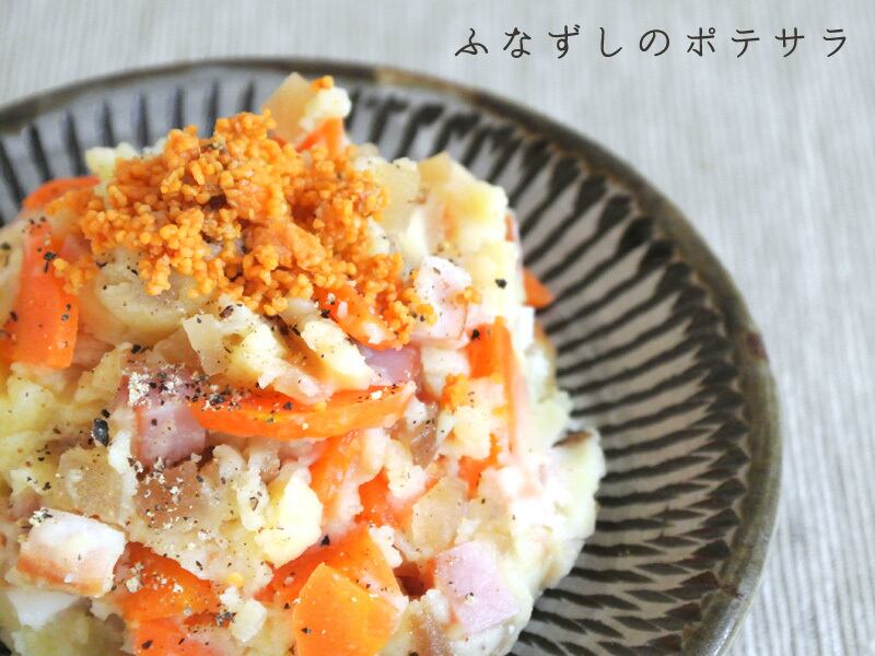 好みのポテトサラダに鮒寿司の薫製発酵ご飯を混ぜて、上に卵の部分を少々振りかけます。かなりの酒泥棒なアテになります。刻んだ燻製ベーコン、いぶりがっこを混ぜると更に美味しいです。