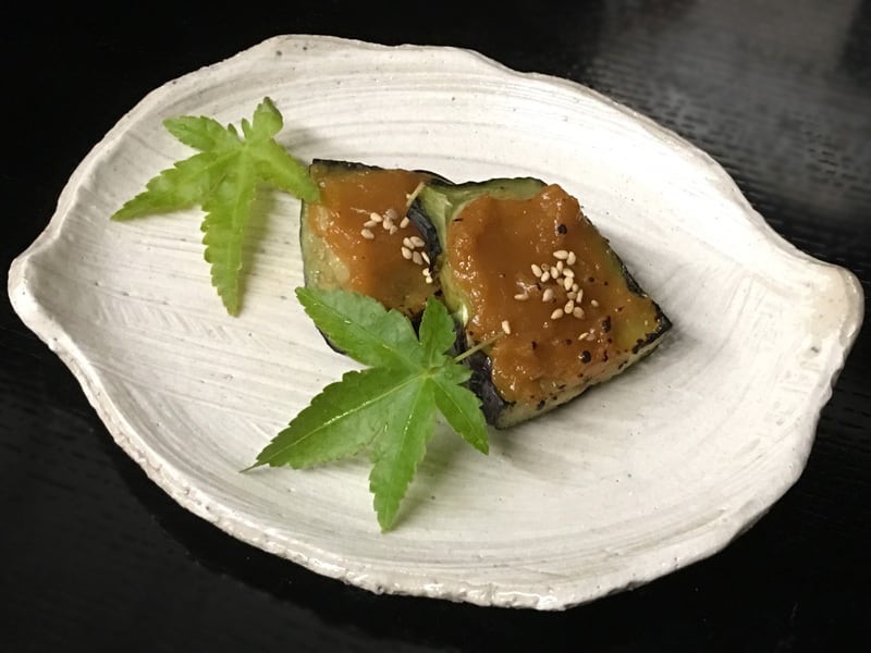 なす1本を縦半分に切り、皮目に軽く切り込みを入れ、熱したフライパンにオリーブオイルを少量入れて馴染ませます。なすを入れ、火が通るまでひっくり返しながら焼きます(なすにオリーブオイルを軽く塗り、1分ほど電子レンジにかけてから焼いてもよい)。発酵ご飯5g、クリームチーズ5g、田楽みそ30gをボウルに混ぜ合わわせ。焼いた茄子に塗ります。最後に胡麻を振り掛けて完成。