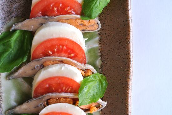 トマト、モッツァレラチーズを均等にスライスします。続いてモッツァレラチーズ、鮒寿司薫製、トマトを交互にサンド。岩塩とブラックペッパーと振り、オリーブオイルをかけて、バジルを添えてお召し上がりください。濃厚な赤ワイン、黒ビールなどとの相性がよく、やみつきになるレシピです。薫製系は古酒とのマリアージュも素晴らしく、近江の地酒と合わせても美味しくお召し上がり頂けます。