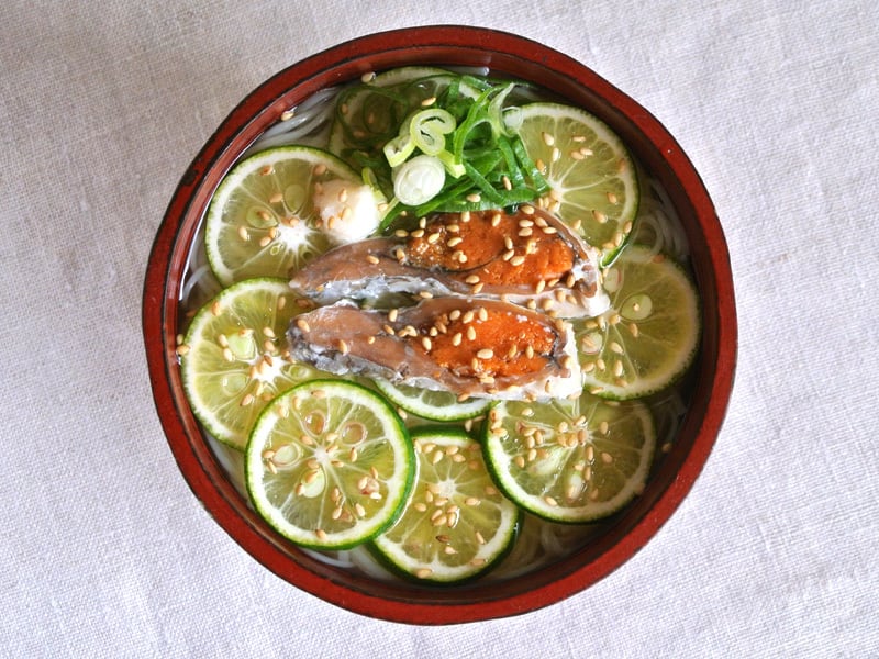チキンブイヨンなどのスープを用意します。茹でた麺(蕎麦・うどん・中華麺・にゅうめん・素麺など)とスープを器に入れ、すだち薄切りを麺の上に綺麗に並べます。そして子持ち鮒寿司スライスを2切れ、発酵ご飯少々、ゴマ、刻みネギを盛り付けて完成。夏は冷麺と冷やスープでひんやりと。半分ほど召し上がったら、熱々のスープを鮒寿司にかけてください。鮒から出汁が滲み出るので、より美味しくなります。